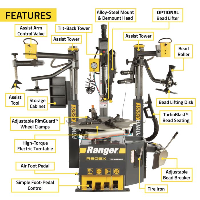 The R80EX tire changer features a dual-assist, tilt-back tower design, so it’s outfitted with the industry’s best and most powerful tools. With the R80EX, you get the classic, rugged reliability Ranger is known for, plus dozens of standard features.